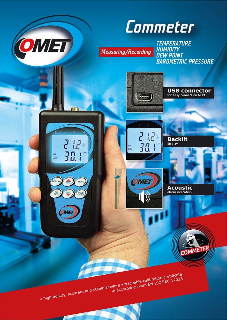 ● Präzise Messung von Temperatur, Luftfeuchtigkeit, Taupunkt, Luftdruck, Zweizustandsereignissen, Impulsen, 4–20 mA, 0–5 V, 0–10 V und CO₂ ● Nichtflüchtiger Speicher ● Akustische und visuelle Alarmanzeige ● Einstellungen über Tastenfeld ● Verschiedene Kommunikationsschnittstellen – USB, RS232, Ethernet ● Software zur Datenanalyse am PC ● Batteriebetrieb ● Display mit Hintergrundbeleuchtung