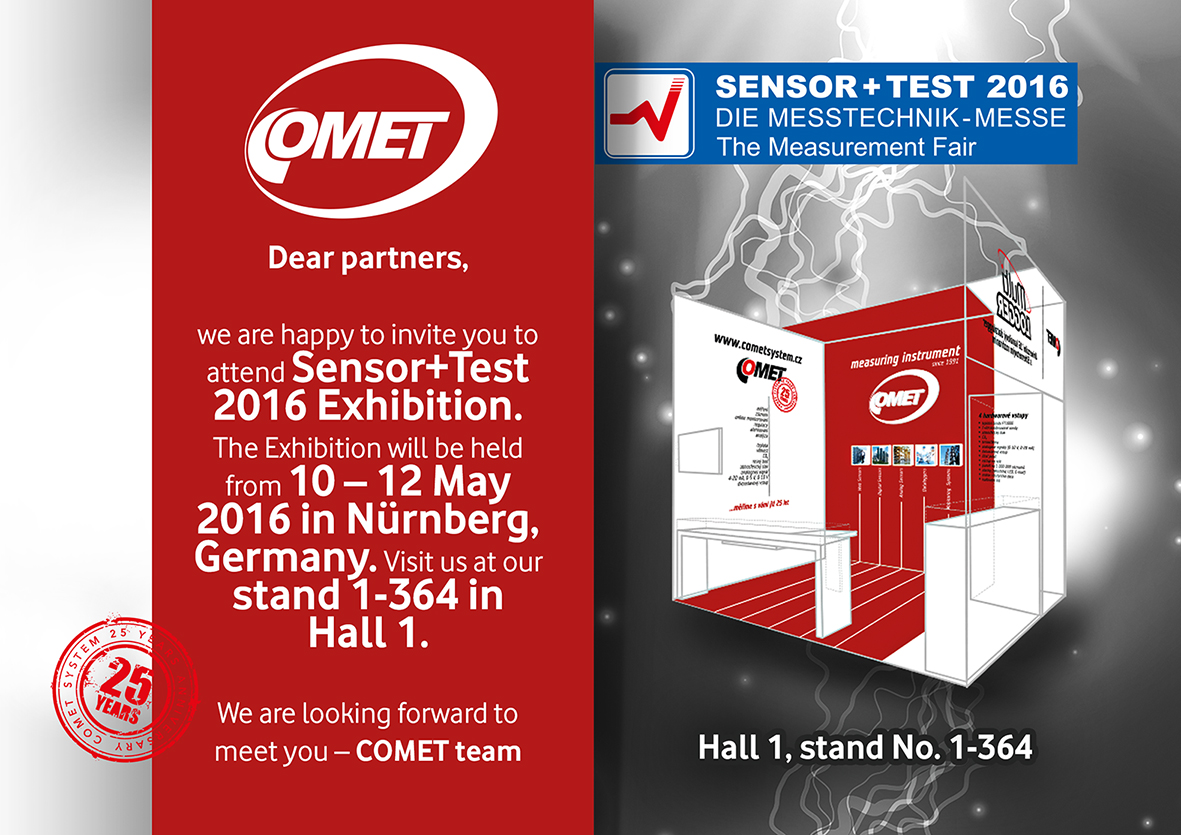 möchten wir Sie herzlich einladen zur SENSOR+TEST2016 Fachmesse in Nürnberg, Deutschland. Kommen Sie und besuchen Sie uns vom 10. - 12. Mai an unserem brandneuen Stand, wo wir Ihnen COMET Neuheiten und Innovationen bei der Messung und Überwachung von Temperatur, Luftfeuchtigkeit, Luftdruck und CO2 vorstellen werden.
