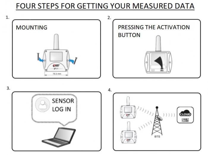 Die gemessenen Werte werden in einem einstellbaren Zeitintervall (10 Min. bis 24 Std.) per Funkübertragung im Sigfox-Netzwerk an die COMET Cloud gesendet, von wo aus der Benutzer sie über einen PC oder ein mobiles Gerät abrufen kann.