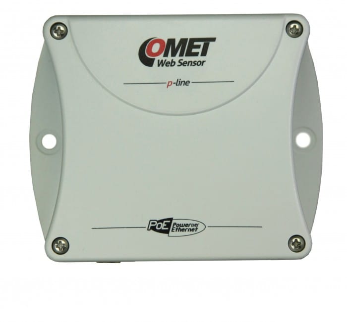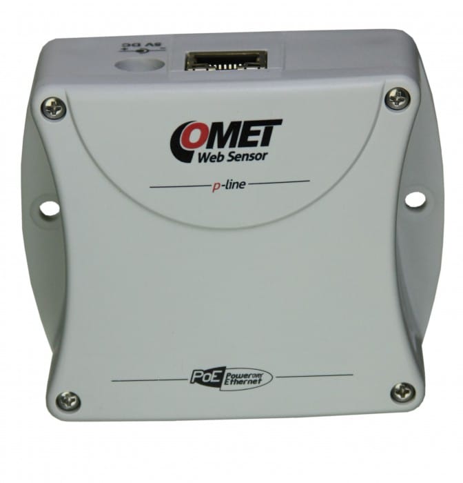 Ein Kanal p-line Web-Sensor mit PoE. Temperatur- oder Feuchtigkeits- + Temperaturfühler wird unterstützt. Fernalarm.