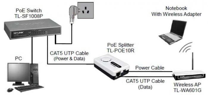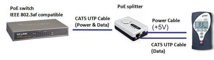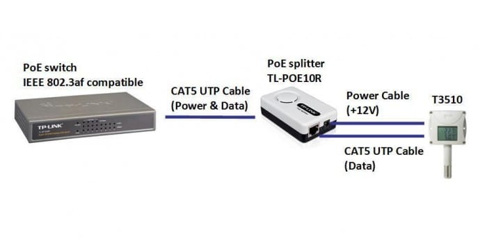 TL-POE10R Power over Ethernet (PoE) Splitter vom Unternehmen TP-Link. Dieser Adapter ist notwendig, um Ethernet-Transmitter oder Multilogger über einen PoE-Switch mit Strom zu versorgen. Es ist notwendig, die richtige Ausgangsspannung über einen Schalter auszuwählen: 12V für Txxxx-Transmitter, 5V für Multilogger !!!