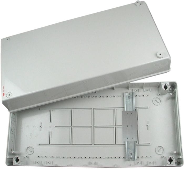 Gehäuse mit IP65-Schutz mit Wandhalterungen und MS-Datenlogger-Halterungen – keine Aussparung im Deckel. Abmessungen 270 x 570 x 140 mm.